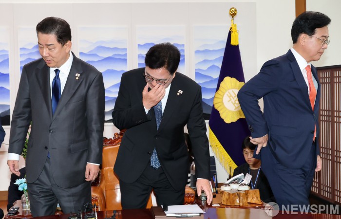 [서울=뉴스핌] 정일구 기자 = 우원식 국회의장이 25일 오후 서울 여의도 국회에서 여야 원내대표들과 회동을 하고 있다. 왼쪽부터 김병기 더불어민주당 원내대표, 우 의장, 송언석 국민의힘 원내대표. 2025.09.25 mironj19@newspim.com