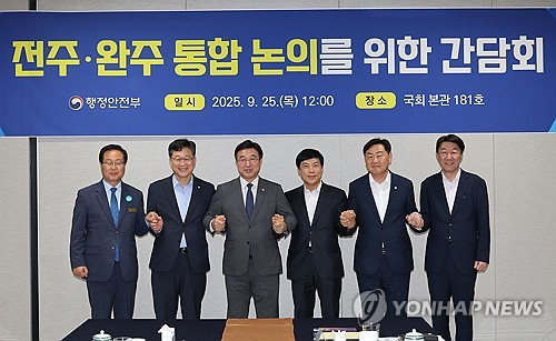 (서울=연합뉴스) 양정우 임채두 기자 = 행정안전부는 25일 국회에서 전북 전주시와 완주군의 통합추진 방향을 논의하는 6자 간담회를 열고, 조만간 주민투표를 실시하는 방안을 포함해 지자체들의 의견을 존중해 결정을 내리기로 했다.