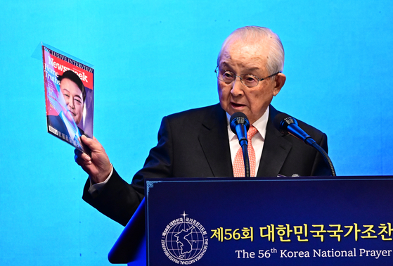 김장환 극동방송 이사장(수원중앙침례교회 목사)가 지난해 11월 22일 서울 중구 신라호텔에서 열린 제56회 국가조찬기도회에서 설교하고 있다. 대통령실사진기자단 |