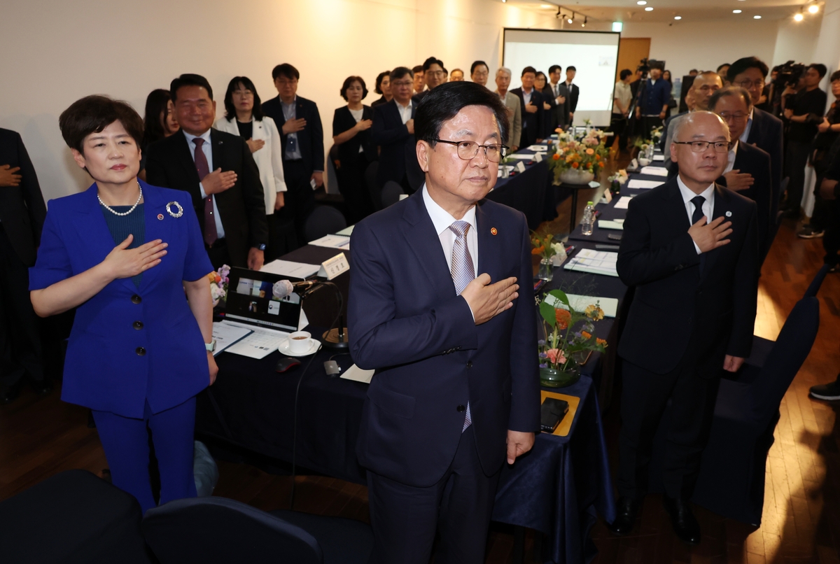 최교진 부총리 겸 교육부 장관이 지난 16일 청주 엔포드호텔에서 열린 시도교육감들과의 간담회에서 국기에 대한 경례를 하고 있다. 이번 간담회는 최 장관과 시도교육감들이 처음 만나는 자리로, 고교학점제와 관련한 시도교육청의 의견을 청취하기 위해 마련됐다. 교육부 제공 |