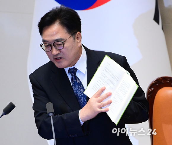 우원식 국회의장이 25일 서울 여의도 국회에서 열린 제429회 국회(정기회) 제9차 본회의에서 '민주유공자 예우 법률안 신속처리안건 지정동의의 건' 투표 중 명패와 투표지 갯수 1개차 불일치가 발생한 것에 대해 항의하는 송언석 국민의힘 원내대표에게 국회법을 보여주며 해결방안을 설명하고 있다. [사진=정소희 기자] |