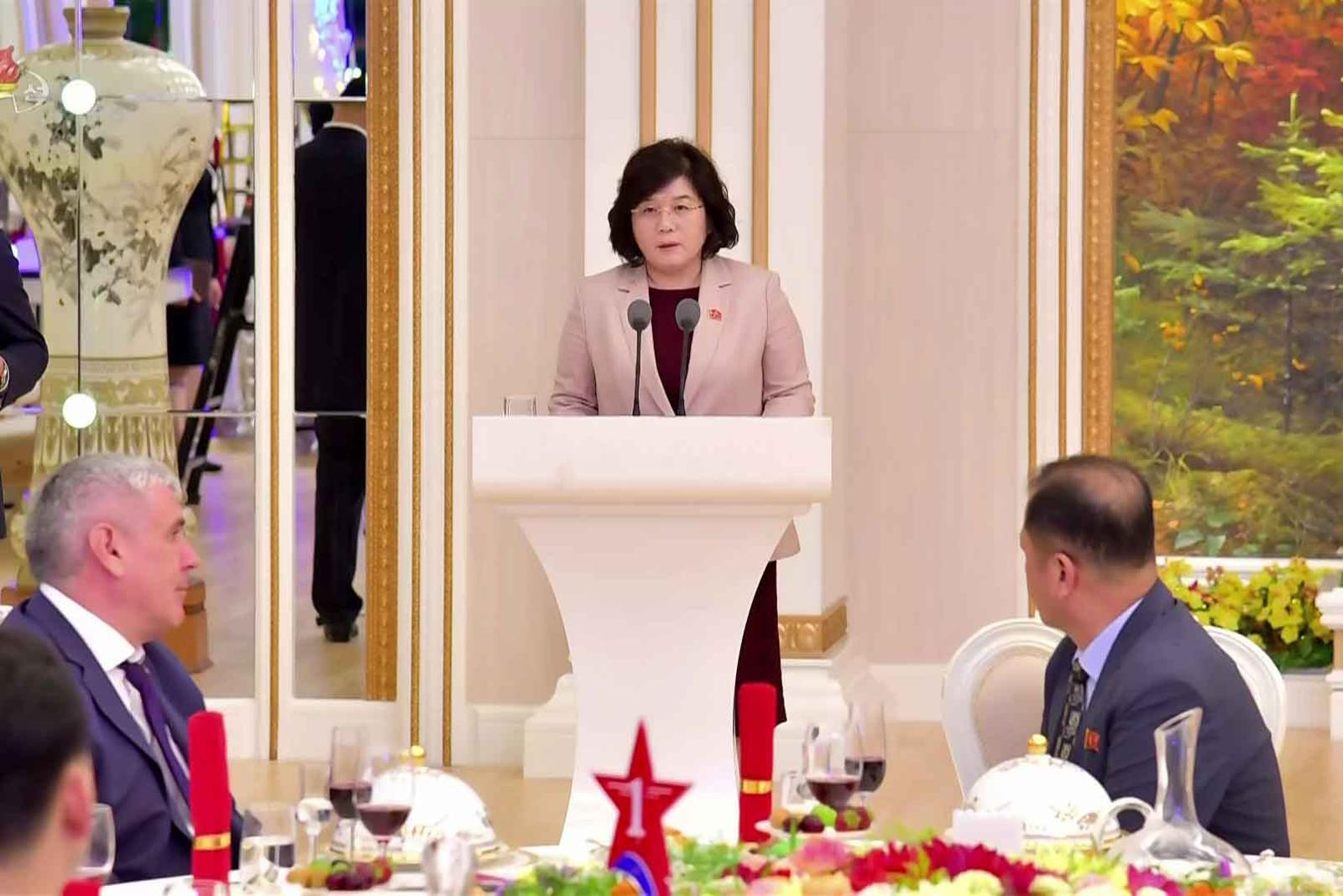최선희 북한 외무상이 지난 19일 북한 러시아 평양수뇌상봉과 포괄적 전략적 동반자관계에 관한 조약체결 1주년에 즈음해 외무성과 북한주재 러시아대사관이 공동으로 개최한 연회에서 발언하고 있다. 2025.06.20 조선중앙TV 캡처 |