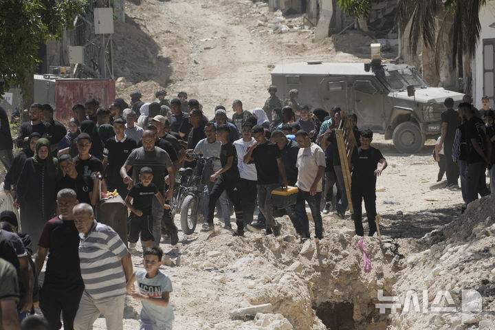 [툴카름=AP/뉴시스] 이스라엘 정부가 요르단강 서안지구 내에서 팔레스타인자치정부(PA)가 통제하는 지역은 합병할 계획 없다고 25일(현지 시간) 밝혔다. 사진은 지난 7월6일 서안지구 툴카름 난민촌에서 팔레스타인 주민들이 이스라엘 보안군의 주택 철거를 앞두고 소지품을 챙겨 집을 떠나는 모습. 2025.09.25. |