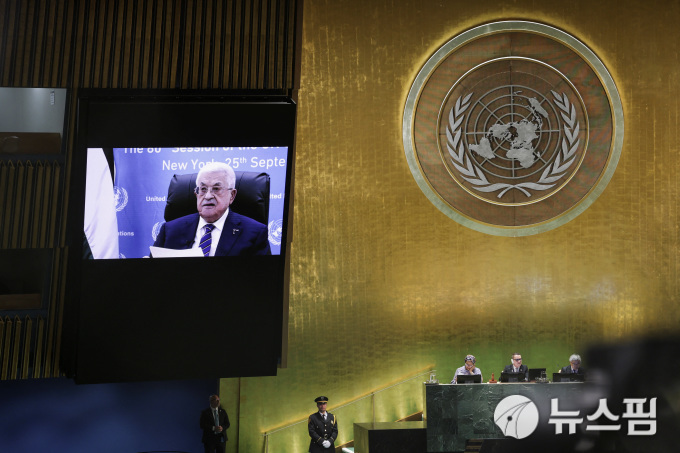 유엔 총회 화상 연설하는 마무드 아바스 팔레스타인 자치정부(PA) 수반. [사진=로이터 뉴스핌] |