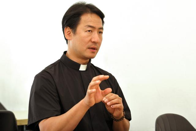 아는 만큼 보이는 종교의 세계. 한국일보 종교기자가 한 달에 한 번씩 생생한 종교 현장과 종교인을 찾아 종교의 오늘을 이야기합니다.송원섭 신부가 22일 인천 서구의 한 카페에서 인터뷰하고 있다. 인천=임지훈 인턴기자 |