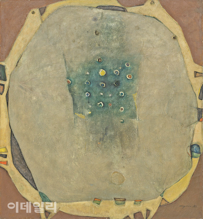 권옥연의 ‘목정 B’(1964). 1950년대 후반 프랑스 유학 중 앵포르멜과 초현실주의의 영향을 받고 귀국한 뒤 동양 정서를 품은 화풍으로 발전시킨 ‘목정’(木精) 연작 중 하나다. 화면을 가득 채운 둥근 공간 속 초록 물빛을 머금은 바탕에는 생명을 틔우는 씨앗인 듯한 색점들이 박혀 있다. 작가 특유의 구성력, 질료, 색감의 조화가 두드러진다. 파리시절부터 작가가 제작한 반구상 작품은 점차 향토적이면서 초현실적인 추상으로 변모해 갔다. 고국에 돌아온 이후엔 전통문화와 민속성을 상징하는 소재·주제로 추상과 구상을 넘나드는 작업을 했다. 지난 5월 1일 국립현대미술관 서울에서 개막한 ‘MMCA 서울 상설전: 한국현대미술 하이라이트’에 나왔다. 캔버스에 유화 물감, 130×120㎝. 국립현대미술관 소장 |