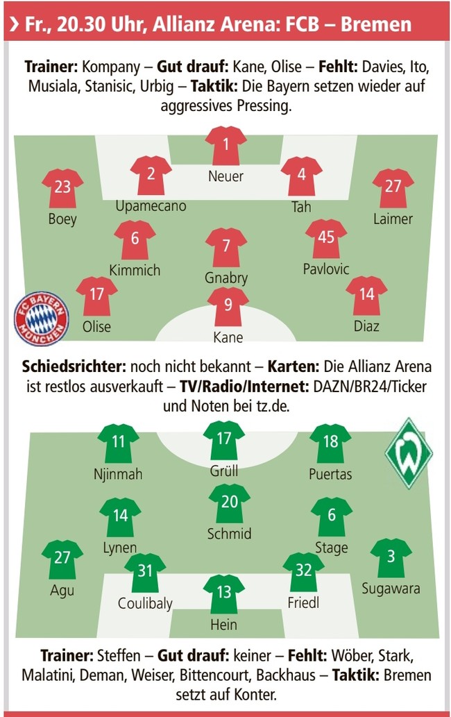 김민재 출전 여부에 많은 관심이 쏠린다. 빈센트 콤파니 감독은 경기를 앞두고 사전 기자회견에서 "오늘 훈련에서 모든 것이 잘 진행된다면 김민재는 브레멘전 소화한다"라며 김민재의 출전 가능성이 있음을 언급했다.