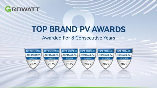 BERLIN Sept. 26, 2025 /PRNewswire=YONHAP/ -- Growatt, a world-leading provider of distributed solar and energy storage solutions (ESS), proudly announces that it has once again been honored with the EUPD Research Top Brand PV Award, marking the company's eighth consecutive year of recognition. In 2025, Growatt received accolades for its inverter brand strength in Mexico, Brazil, Pakistan, Germany, and the Middle East & North Africa, while also earning recognition for its energy storage solutions in Australia.