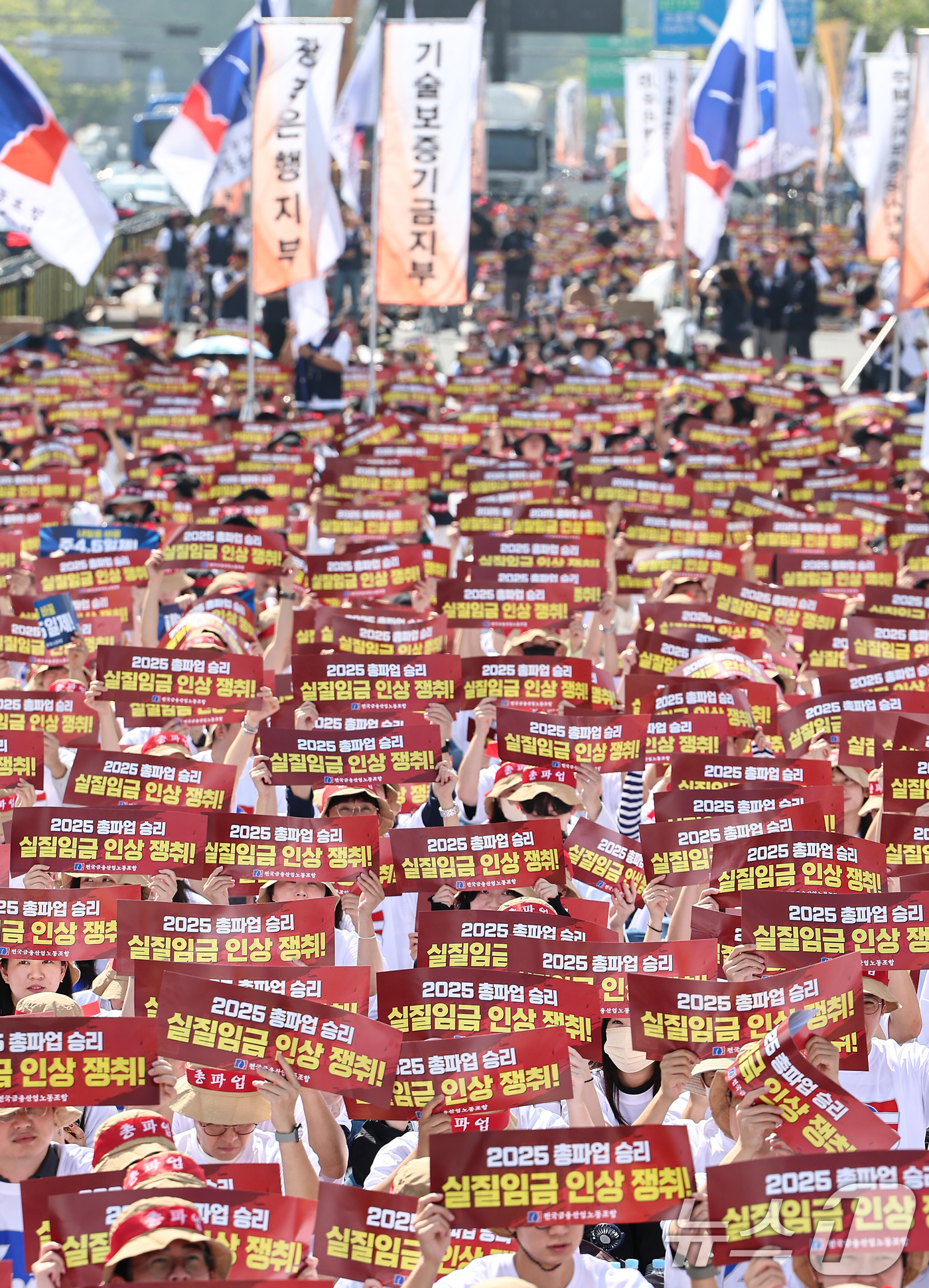 (서울=뉴스1) 김도우 기자 = 전국금융산업노동조합 조합원들이 26일 서울 종로구 광화문네거리 인근에서 열린 총파업 대회에서 주 4.5일제, 임금인상 등을 촉구하며 구호를 외치고 있다. 2025.9.26/뉴스1