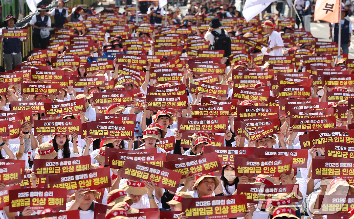 (서울=뉴스1) 김도우 기자 = 전국금융산업노동조합 조합원들이 26일 서울 종로구 광화문네거리 인근에서 열린 총파업 대회에서 주 4.5일제, 임금인상 등을 촉구하며 구호를 외치고 있다. 2025.9.26/뉴스1