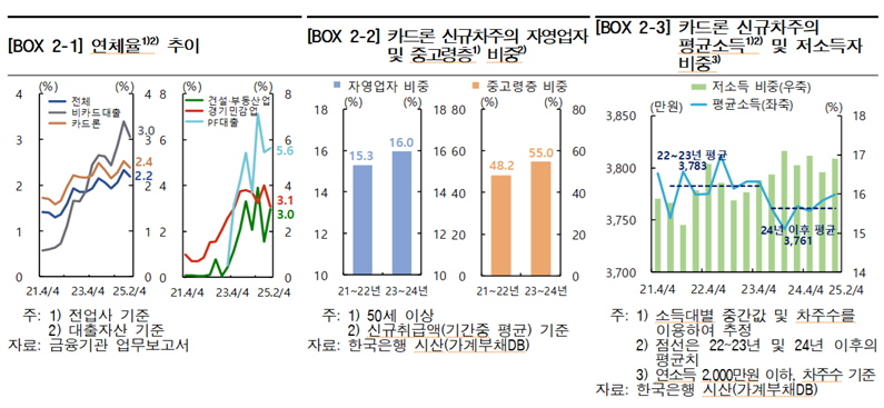 한은은 건전성 저하 요인으로 카드론을 지목했다. 카드론 연체율은 2021년말 1.7%에서 올해 2분기 말 2.4%로 상승했다.