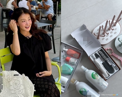 사진 속에는 한 업체로부터 협찬받은 육아용품 키트들이 담겨 있다. 젖병건조대와 젖병집게, 바디워시, 샴푸, 세탁 세제 등 출산을 앞두고 준비해야 하는 물품들이 놓여져있다.