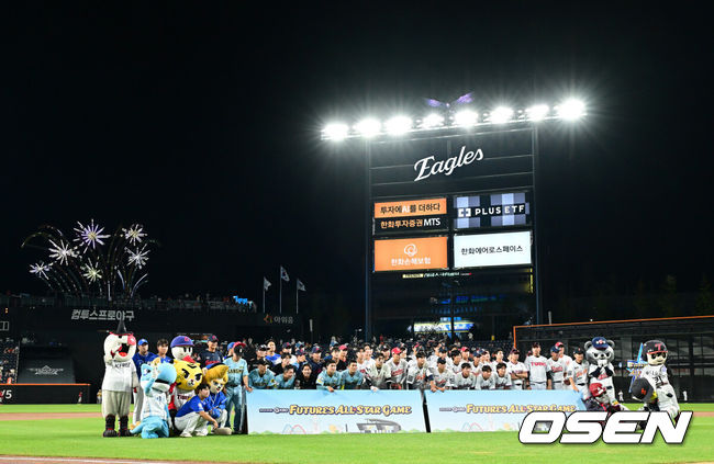[OSEN=대전, 지형준 기자] SSG, 한화 팬들은 행복했다. 구단의 미래 최윤석(SSG), 한지윤(한화)의 활약을 등에 업은 북부리그 올스타가 퓨처스리그 올스타전 승자로 우뚝 섰다.이대진 감독이 이끄는 북부리그 올스타(한화 이글스, SSG 랜더스, LG 트윈스, 두산 베어스, 고양 히어로즈)는 11일 대전 한화생명볼파크에서 개최된 2025 KBO 퓨처스 올스타전에서 박치왕 감독이 지휘하는 남부리그 올스타(상무, KT 위즈, 삼성 라이온즈, NC 다이노스, 롯데 자이언츠, KIA 타이거즈)를 4-2로 제압했다.북부리그 올스타는 지난해 5-9 패배를 설욕하고 2023년 이후 2년 만에 올스타전 승리를 맛봤다.퓨처스 올스타 선수들이 기념 촬영을 하고 있다. 2025.07.11 / jpnews@osen.co.kr |