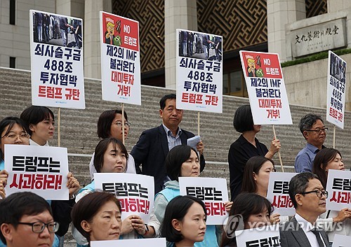 이들은 "도널드 트럼프 미국 대통령이 대미 투자 금액 3천500억 달러(약 493조원)를 '선불'이라고 협박하고 있다"며 "날강도라는 말이 절로 나온다"고 주장했다.