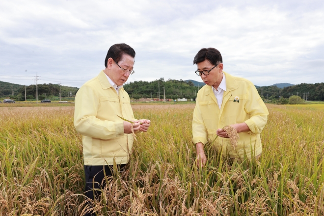 김철우 보성군수와 김영록 전남지사가 미력면에서 벼 깨씨무늬병 피해 현장 점검을 하고 있다. |