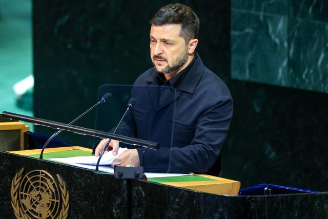 볼로디미르 젤렌스키 우크라이나 대통령이 24일 미국 뉴욕에서 유엔 총회에 참석해 연설하고 있다. 뉴욕=타스 연합뉴스 |