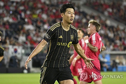 (서울=연합뉴스) 이영호 기자 = 미국 메이저리그사커(MLS) 로스앤젤레스(LA)FC의 '골잡이' 손흥민(33)이 '태극전사 후배' 정상빈(세인트루이스)과의 '코리안 더비'에서 시즌 7·8호골을 잇달아 폭발하며 4경기 연속골을 터뜨렸다.
