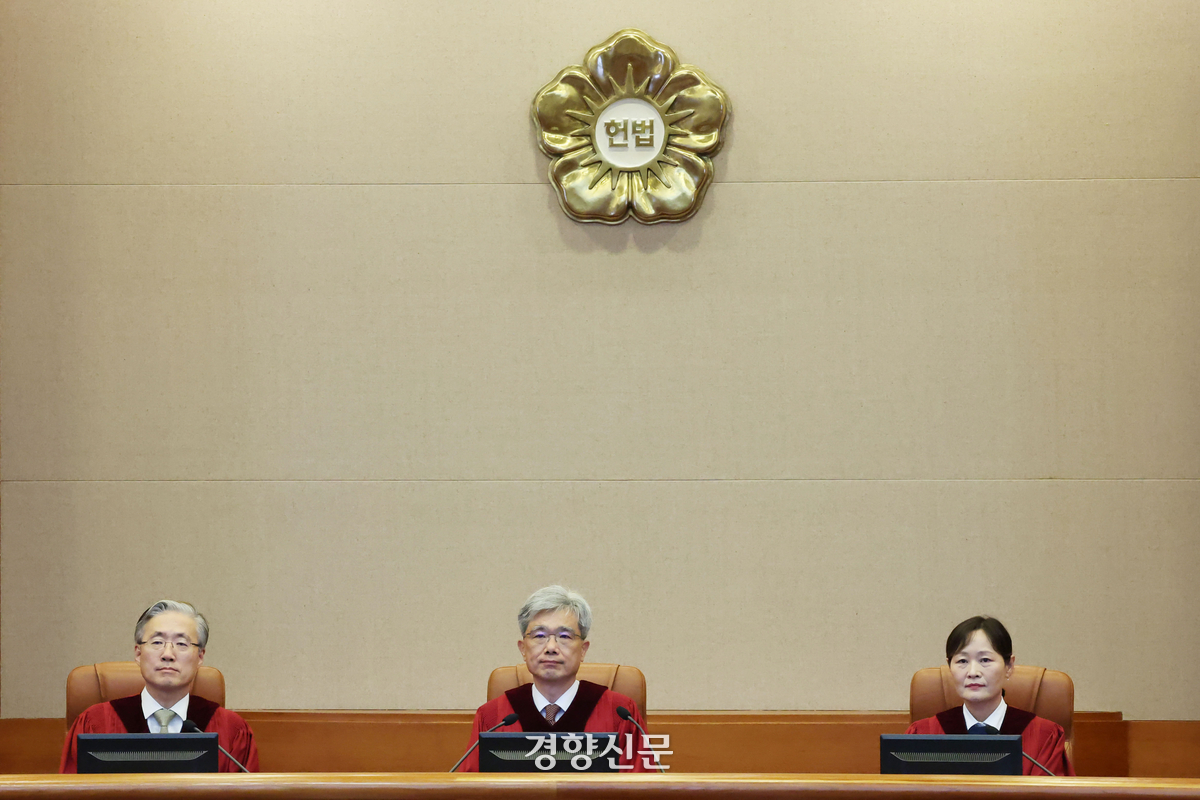 김상환 헌법재판소장과 헌법재판관들이 서울 종로구 헌법재판소 대심판정에 착석해 있다. 한수빈 기자 |