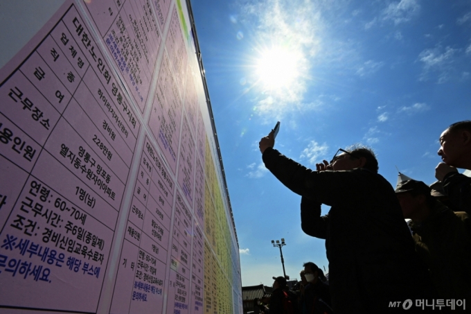 [수원=뉴시스] 김종택 기자 = 28일 경기도 수원시 팔달구 화성행궁 광장에서 열린 '노인일자리 채용한마당'을 찾은 어르신들이 채용정보 게시판을 살펴보고 있다. 2025.03.28. /사진=김종택 |