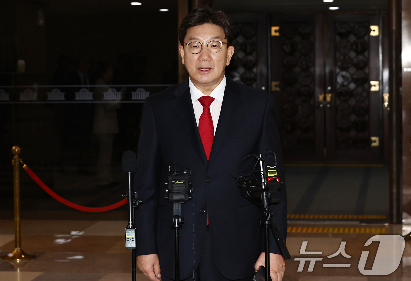 권성동 국민의힘 의원이 지난 11일 서울 여의도 국회에서 열린 본회의에서 권 의원에 대한 체포동의안에 표결한 뒤 입장을 밝히고 있다. 2025.9.11/뉴스1 ⓒ News1 김민지 기자 |