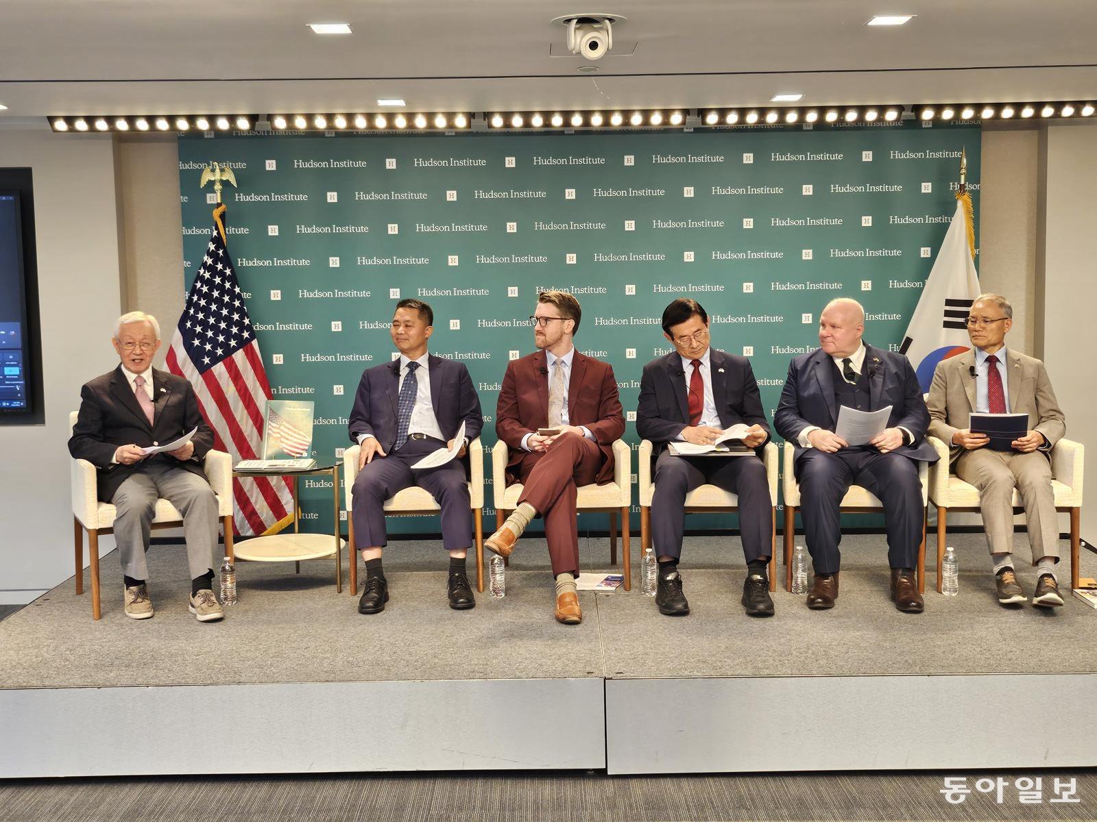 동아일보 부설 화정평화재단(이사장 현인택)과 한미안보연구회가 공동 주최한 제39회 한미 국제안보회의가 23일(현지 시간) 미국 워싱턴 허드슨연구소에서 열렸다. 왼쪽부터 허남성 국방대학교 명예교수, 장진섭 박사·매사추세츠대 한반도연구디렉터, 라일리 월터스 허드슨연구소 선임연구원, 최병혁 전 주사우디아라비아대사, 데이비드 맥스웰 아시아태평양전략센터 부회장, 장삼열 한미안보연구회 사무총장. 워싱턴=신진우 특파원 niceshin@donga.com |