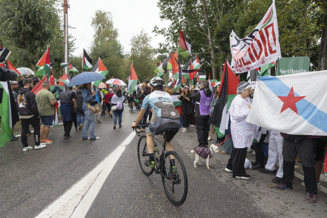 지난 9일(현지시간) 스페인 갈리시아주 폰테베드라에서 열린 부엘타 아 에스파냐 사이클 대회 도중, 이스라엘-프리미어 테크 팀의 출전을 반대하는 시위가 벌어지고 있다. /EPA 연합뉴스 |