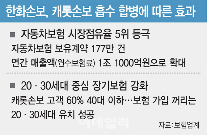 28일 보험업계에 따르면 한화손보는 내달 1일 캐롯손보를 흡수 합병한다. 특히 자동차보험 보유계약이 약 177만건, 연간 매출액(원수보험료)이 약 1조 1000억원에 이르는 등 시장점유율이 5위로 올라선다. 올해 상반기 캐롯손보의 자동차보험 보유계약은 75만건, 원수보험료는 2204억원으로 집계됐다.