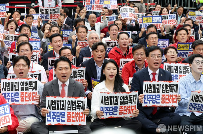 [서울=뉴스핌] 정일구 기자 = 장동혁 국민의힘 대표와 송언석 원내대표를 비롯한 소속 의원들이 28일 오후 서울 중구 시청역 인근에서 열린 사법파괴·입법독재 국민 규탄대회에서 손피켓을 들고 구호를 외치고 있다. 2025.09.28 mironj19@newspim.com