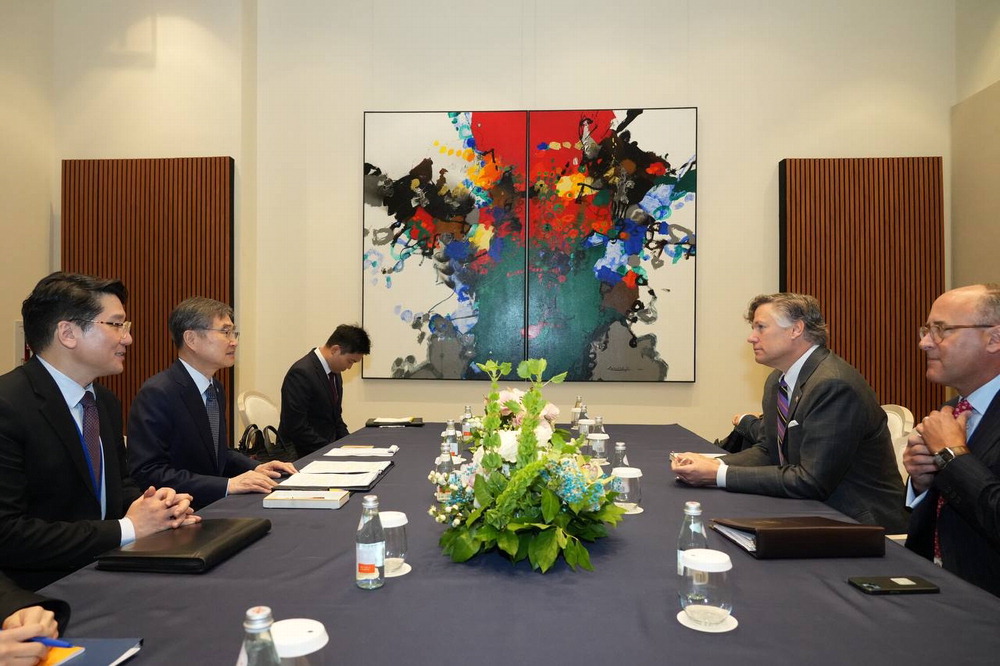 美 국무부 부장관 접견한 조현 조현 외교부 장관(왼쪽 가운데)이 26일(현지시간) 미국 뉴욕에서 크리스토퍼 랜다우 미국 국무부 부장관(오른쪽 가운데)을 접견하고 조지아주 한국인 구금 사태를 거론하며 비자 제도 개선 조치를 촉구했다. 외교부 |