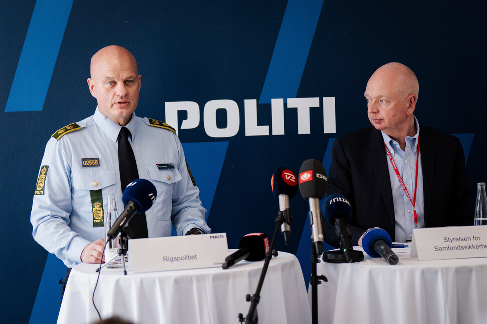 26일 덴마크 코펜하겐 경찰본부에서 피터 에케뷔어그 덴마크 경찰 총경(왼쪽)이 최근 드론 출몰 사태 관련 기자회견을 하고 있다. AP 연합뉴스 |