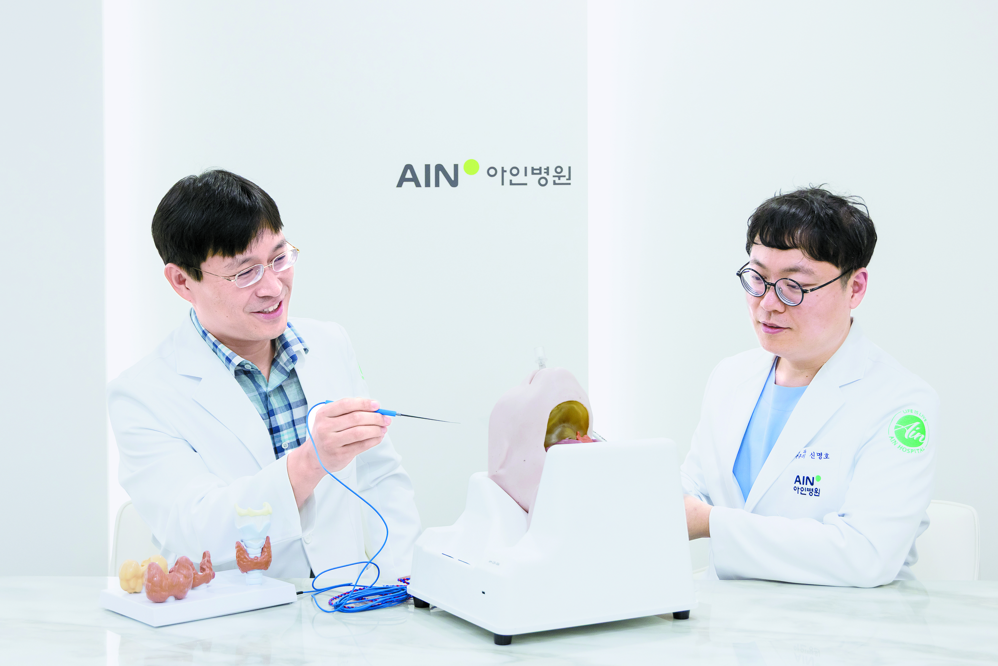 갑상샘암(갑상선암)은 국내 발병률 1위의 암이다. 치료의 기본은 외과적 절제술. 이때 외부에 드러나는 흉터 못지않게 환자가 걱정하는 부분은 목소리의 변화다. 성대의 움직임을 담당하는 신경이 갑상샘과 가깝다 보니 자칫하면 수술 과정에서 손상돼 음성 장애를 남길 수 있어서다. 이에 대한 해법을 듣기 위해 전문가를 찾았다. 인천 아인병원 갑상선암센터 이진욱 센터장과 신명호 과장이다. 두 사람은 갑상샘암 치료 분야의 전문가로, 이 센터장은 한쪽 유륜(젖꼭지 둘레의 거무스름하고 동그란 부분)을 2.5㎝만 절개해 갑상샘암을 제거하는 수술법을 세계 최초로 개발해 학계의 관심을 받기도 했다.