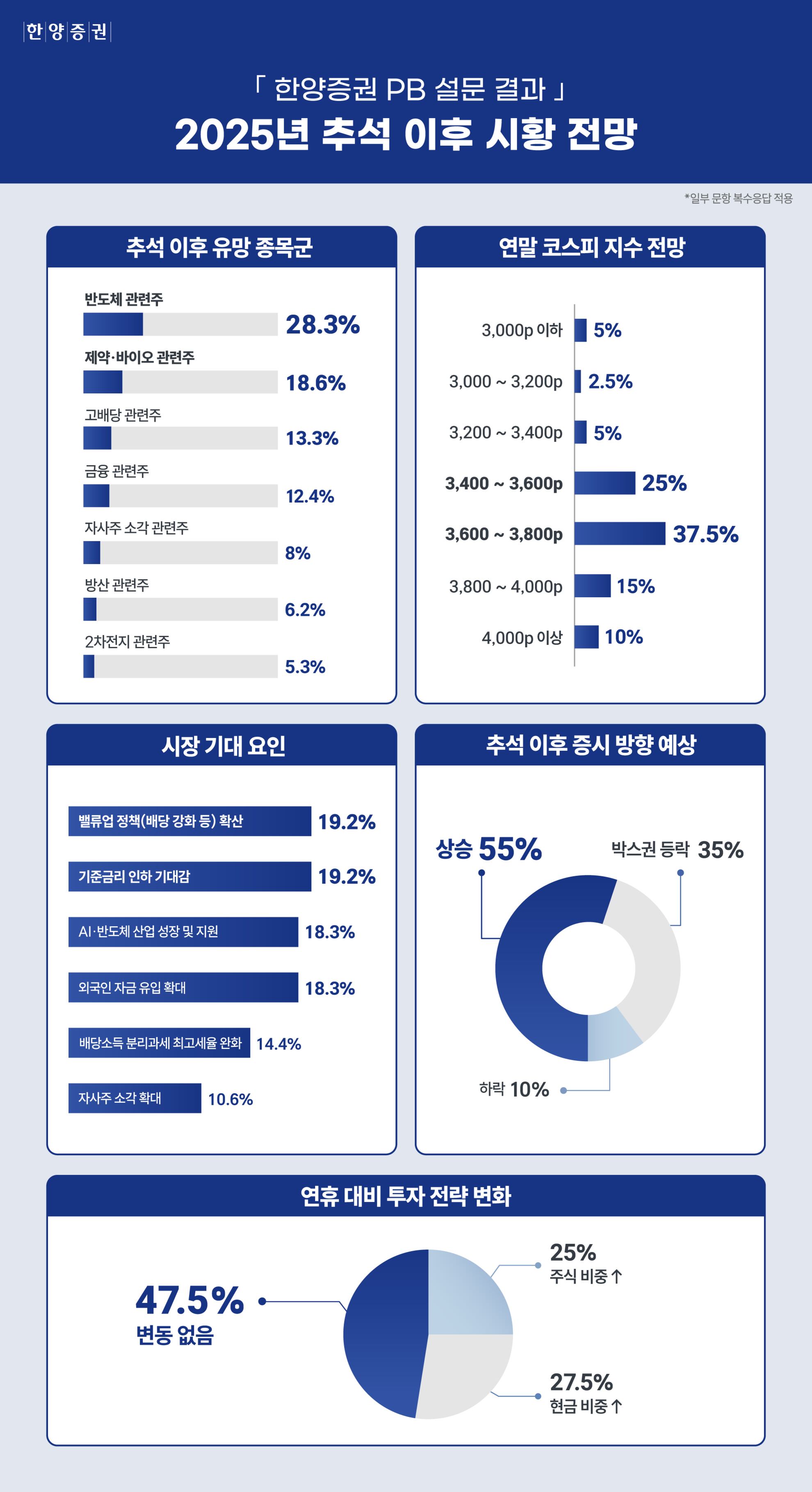 다만 추석 연휴를 앞두고 47.5%가 이전과 투자 전략이 “큰 차이가 없다”고 답했다. 단기적 시장 방향성보다 구조적 성장성과 정책 변수 등을 고려했기 때문으로 보인다고 한양증권은 설명했다. 27.5%는 현금을 비롯한 안전자산 비중을 늘렸고, 반대로 25%는 주식 등 투자자산 비중을 확대했다고 답했다.