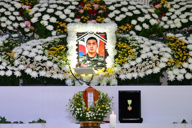 2023년 7월 21일 해병대 1사단 내 김대식관에 마련된 고 채수근 상병의 빈소 영정 앞에 정부가 추서한 보국훈장 광복장이 놓여 있다. 뉴스1 |