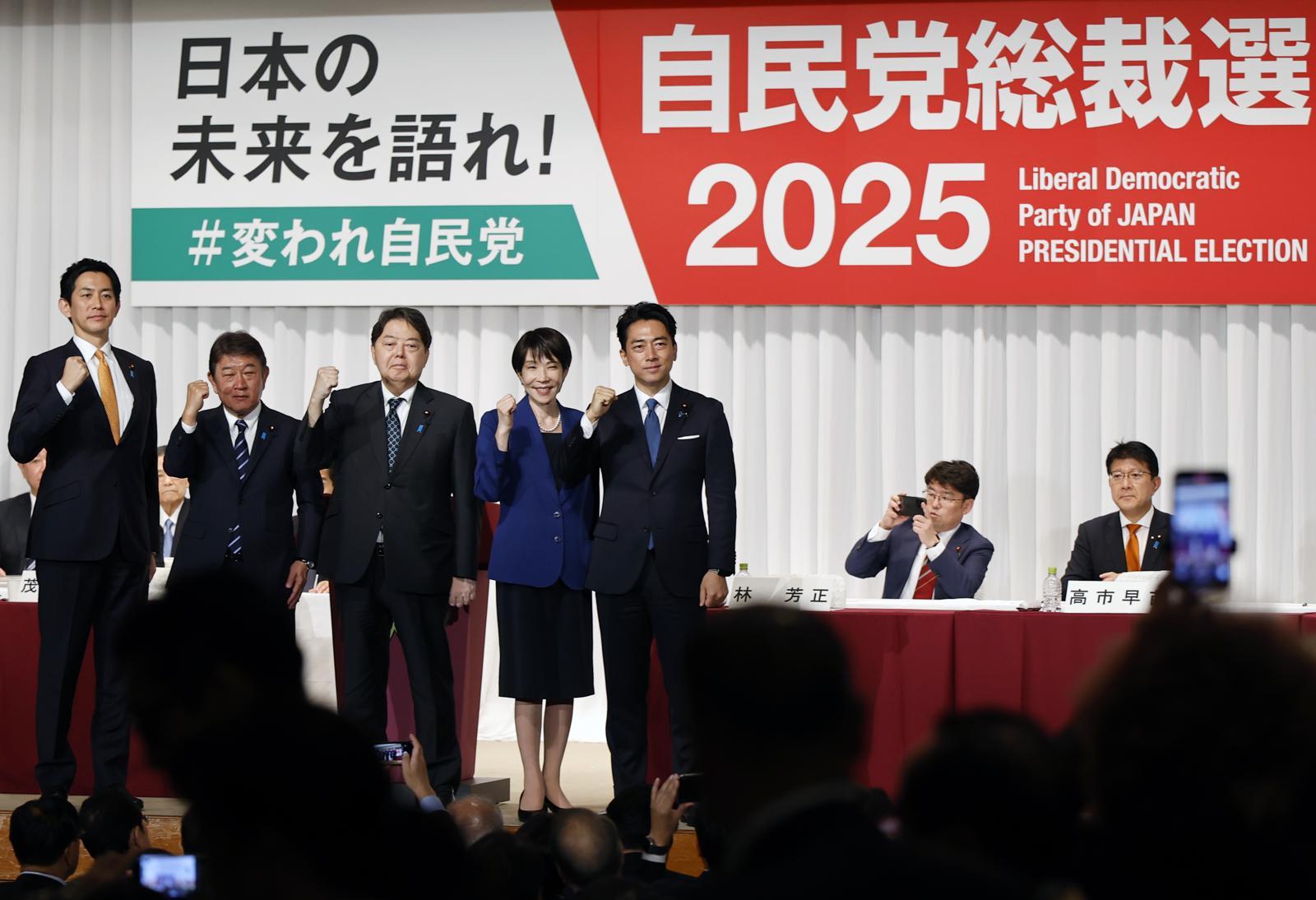 22일 도쿄 자민당 당사에서 열린 자민당 차기 총재 선거에 입후보한 고바야시 다카유키(왼쪽부터) 전 경제안보담당장관, 모테기 도시미쓰 전 외무장관, 하야시 요시마사 관방장관, 다카이치 사나에 전 경제안보담당장관, 고이즈미 신지로 농림수산장관이 연설을 마친 뒤 포즈를 취하고 있다. 도쿄=AP 뉴시스 |