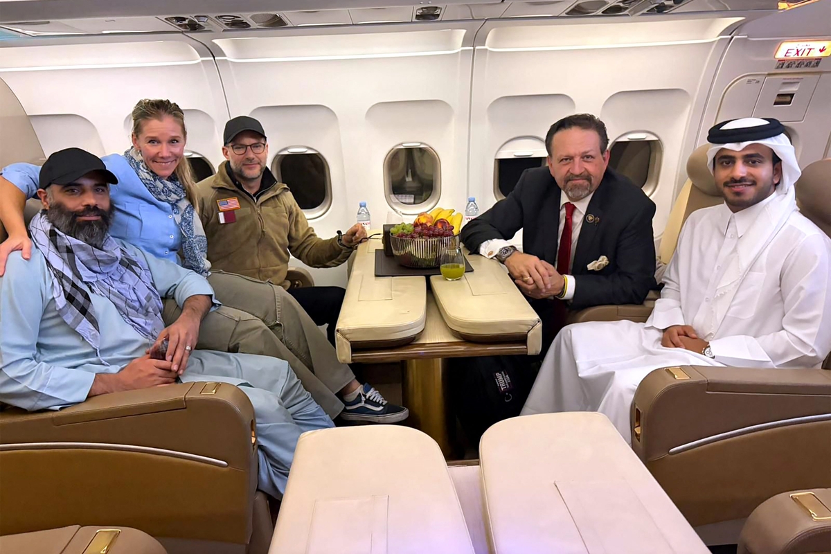 카타르 외무부가 28일(현지시간) 공개한 사진에서 아프가니스탄 탈레반 당국에 의해 구금됐다 풀려난 미국인 아미르 아미리(맨 왼쪽)가 석방된 후 미국 인질 대응 특사 아담 뵐러(왼쪽에서 세 번째부터), 백악관 관리 세바스찬 고르카, 카타르 외교관과 함께 비행기에 탑승해있다. AFP연합뉴스 |
