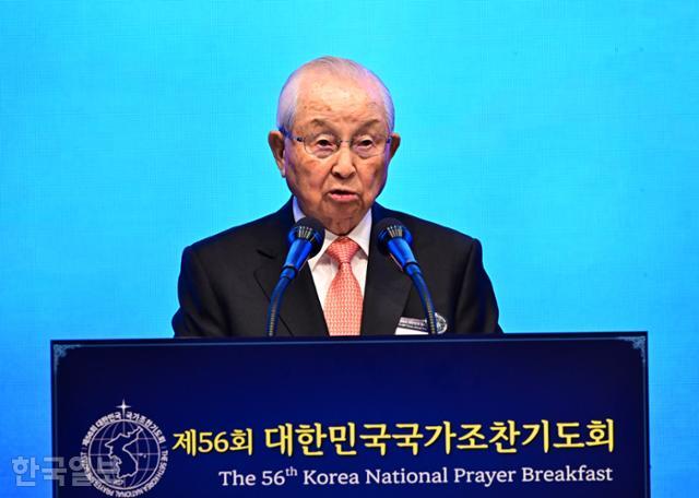 김장환 극동방송 이사장이 지난해 11월 22일 서울 중구 신라호텔에서 열린 제56회 국가조찬기도회에서 설교하고 있다. 왕태석 선임기자 |
