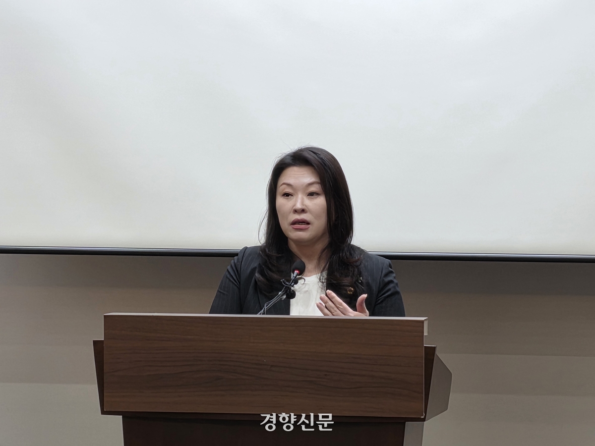 박진희 충북도의원이 29일 충북도청 브리핑룸에서 기자회견을 하고 윤건영 충북교육감의 ‘골프 접대 의혹’과 관련, 추가 의혹을 폭로하고 있다. 이삭 기자. |