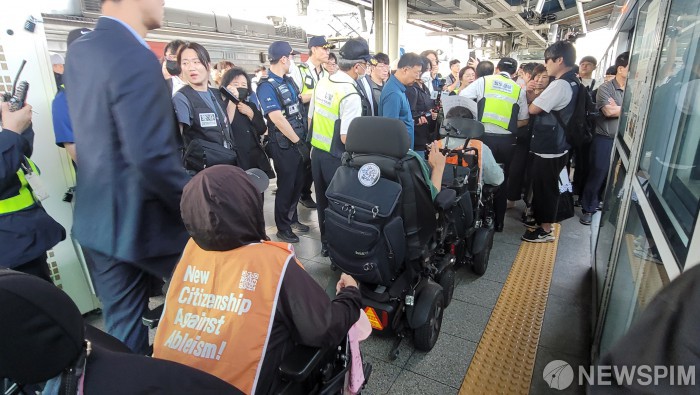 [서울=뉴스핌] 전국장애인차별철폐연대가 29일 오전 서울 지하철 1호선 노량진역에서 ‘64차 출근길 지하철탑니다’ 탑승시위를 하고 있다. [사진=독자제공] 2025.09.29 photo@newspim.com |
