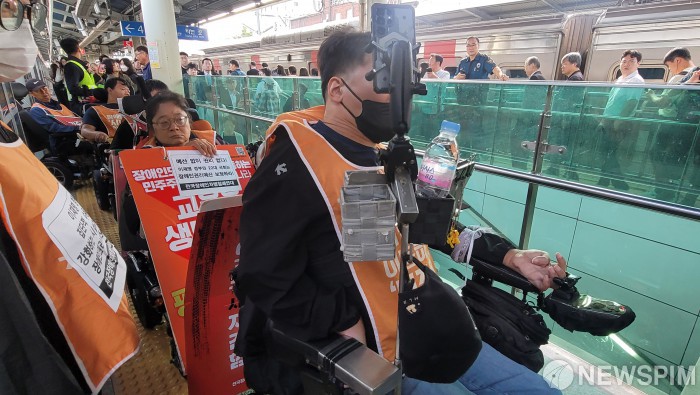 [서울=뉴스핌] 전국장애인차별철폐연대가 29일 오전 서울 지하철 1호선 노량진역에서 ‘64차 출근길 지하철탑니다’ 탑승시위를 하고 있다. [사진=독자제공] 2025.09.29 photo@newspim.com |