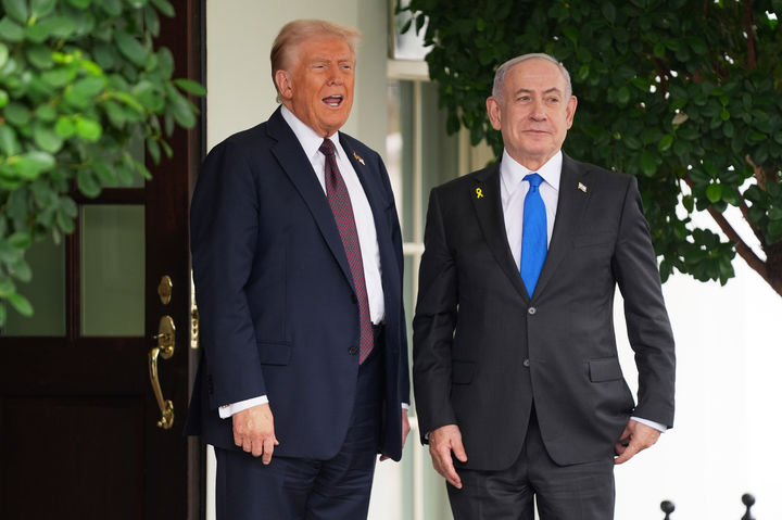 [워싱턴=AP/뉴시스]도널드 트럼프 미국 대통령이 29일(현지 시간) 미 워싱턴DC 백악관을 방문한 베냐민 네타냐후 총리를 맞아들이고 있다. 2025.09.30. |
