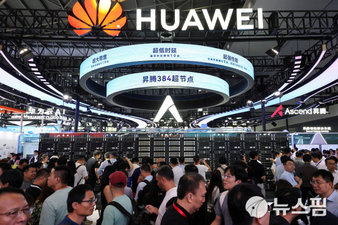 2025년 7월 26일, 중국 상하이에서 열린 세계 인공지능 대회(World Artificial Intelligence Conference)에서 관람객들이 화웨이(Huawei) 부스를 방문하고 있다.[사진=로이터 뉴스핌] |