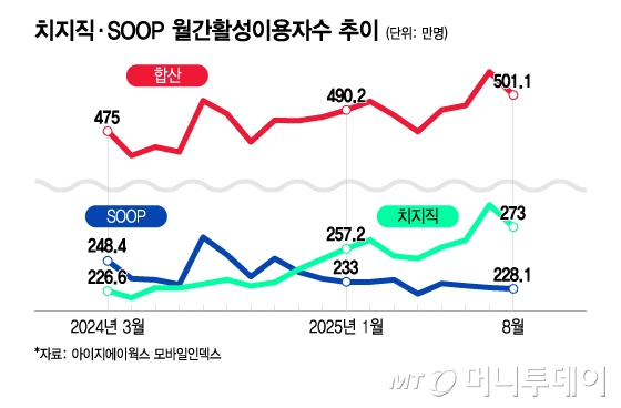 치지직과 SOOP의 월간 활성 이용자 수(MAU) 추이는 한 회사가 증가하면 다른 회사가 감소하는 등 서로 '빼앗는' 양상이 짙었다. 아이지에이웍스 모바일인덱스에 따르면 양사의 월간 활성 이용자 수 합계는 최근 2년간 460만~520만명에 갇혀있다.