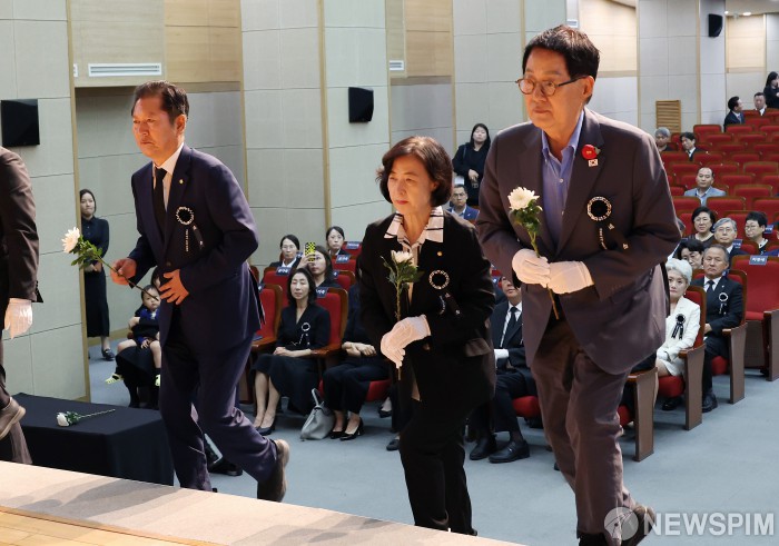 [서울=뉴스핌] 정일구 기자 = 더불어민주당 정청래, 추미애, 박지원 의원이 10일 오전 서울 동작구 고(故) 이희호 여사 서거 6주기 추모식에서 헌화하고 있다. 2025.06.10 mironj19@newspim.com |