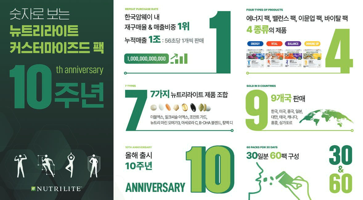 최근 건강 수명, 저속 노화에 대한 관심이 커지면서 ‘맞춤형 건강기능식품(건기식)’이 대세로 떠오르고 있다. 암웨이의 건강기능식품 브랜드 뉴트리라이트(Nutrilite)는 국내 맞춤형 건기식 시장을 이끄는 대표적인 브랜드로 꼽힌다. 특히 2015년 국내 첫 맞춤형 건기식으로 선보인 ‘커스터마이즈드 팩’이 올해 론칭 10주년을 맞아 주목받는다. 뉴트리라이트의 상징적인 제품으로 자리매김한 커스터마이즈드 팩의 성공 비결과 가치를 주요 숫자 키워드로 살펴본다.
