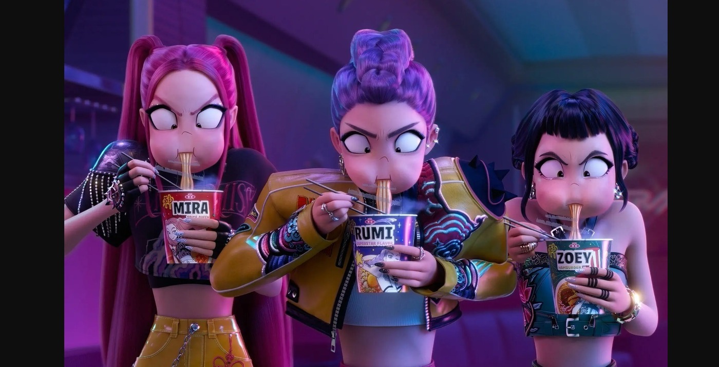 넷플릭스 애니메이션 영화 '케이팝 데몬 헌터스'에서 여주인공들이 컵라면을 먹는 장면(뉴욕타임스 갈무리). |