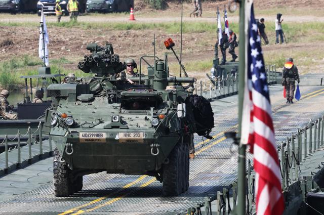지난달 경기 여주시에서 열린 한미연합 도하훈련에서 주한미군 스트라이커 장갑차가 도하하고 있다. 연합뉴스 |