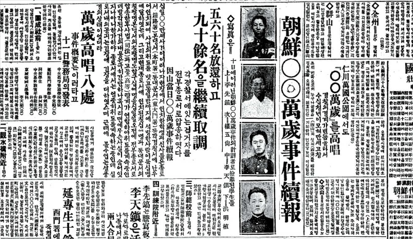 “우리가 이 인산일(因山日·황제나 왕 등의 장례일)을 당하야 울고 부르지지는 이 마음으로써 우리 민족의 향상을 위하야 무한히 노력하여야만 우리의 울음이 참으로 가치잇게 되는 것을 알어야 하겟다.” 조선일보 1926년 6월 10일 조간 1면의 논설 끝부분이다. 이 논설은 앞부분 5행부터 모두 29행이 삭제된 채로 인쇄됐다. 일제 검열의 흔적이다.