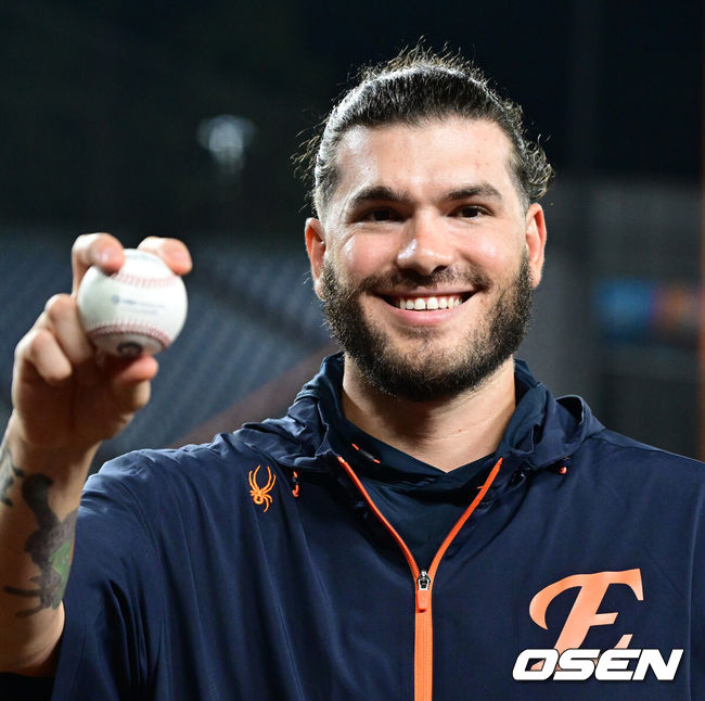 [OSEN=대전, 최규한 기자] 시즌 228탈삼진 기록을 세운 한화 코디 폰세가 기념구를 들고 포즈를 취하고 있다. 2025.09.03 / dreamer@osen.co.kr |