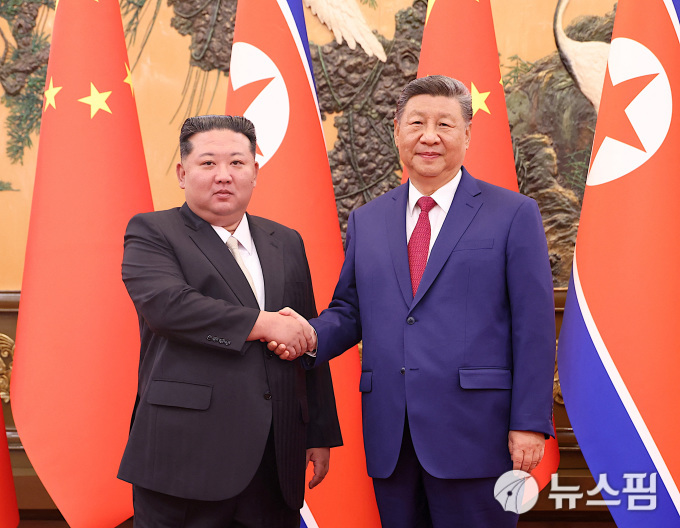 [베이징 로이터=뉴스핌] 김정은 북한 노동당 총비서(왼쪽)와 시진핑 중국 국가주석이 4일(현지시간) 중국 베이징 인민대회당에서 정상회담을 앞두고 악수를 하고 있다. 2025.09.04 wcn05002@newspim.com |