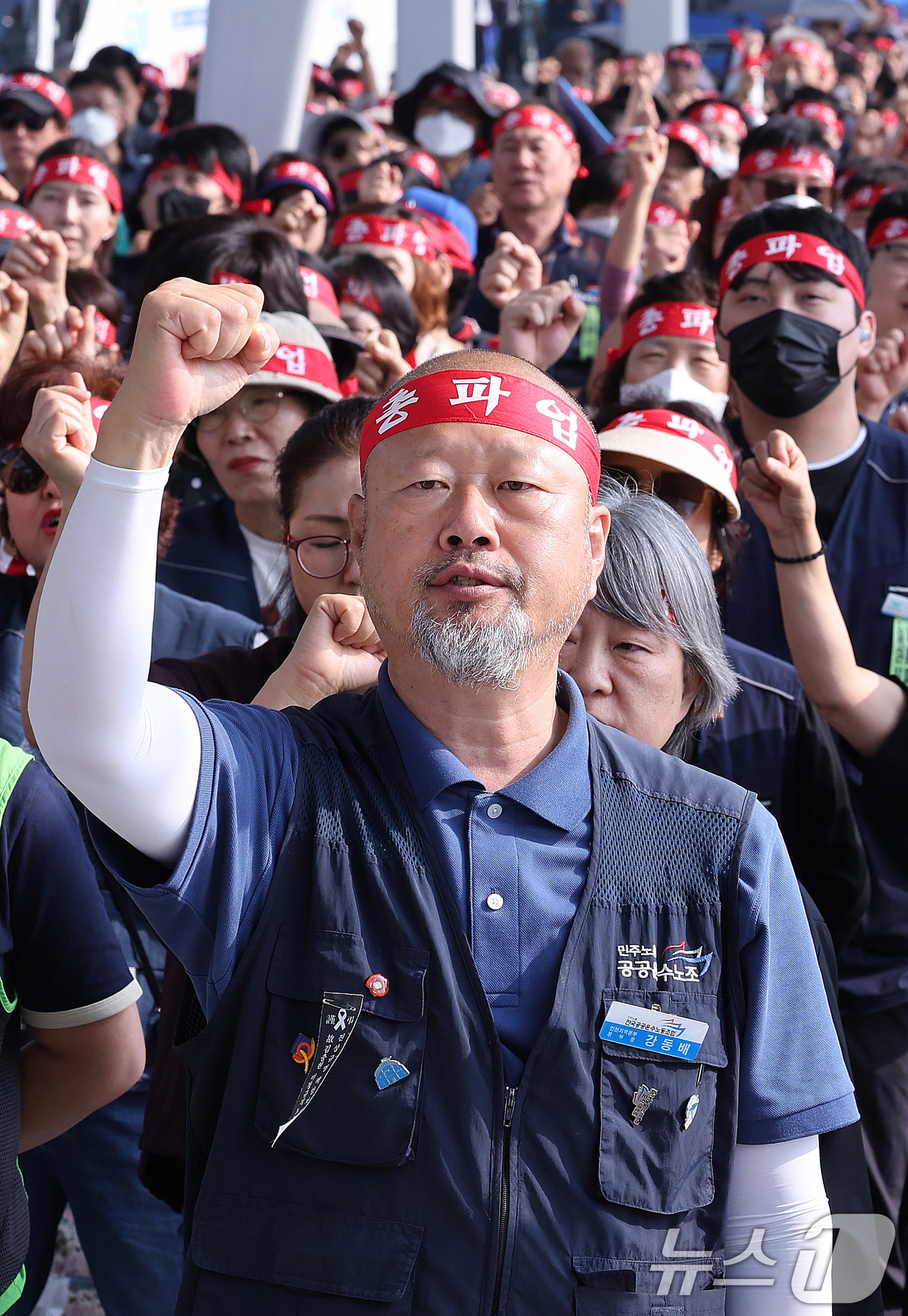 (인천공항=뉴스1) 박지혜 기자 = 인천공항 등 전국 15개 공항 노동자들이 1일 인천국제공항 1터미널에서 열린 무기한 전면파업 1일차 출정식에서 구호를 외치고 있다. 전국공항노동자연대는 이번 총파업을 요구사항이 수용될 때까지 개천절과 추석 명절 연휴를 포함해 무기한 이어가겠다고 밝혔다. 앞서 공항 노동자들은 지난달 19일에도 3조 2교대 근무 체계를 4조 2교대로 전환할 것을 요구하며 하루 경고파업을 진행한 바 있다. 2025.10.1/뉴스1